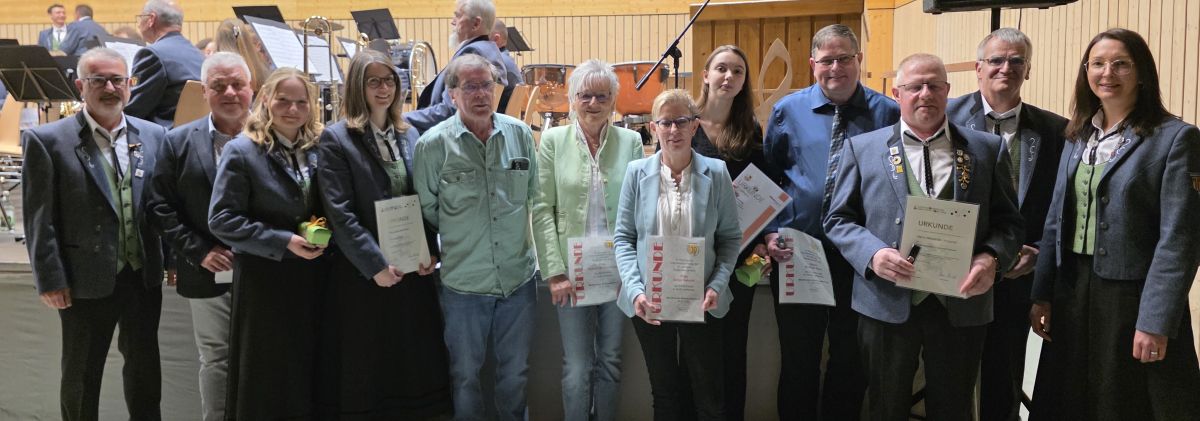 Der Konzertabend diente auch in diesem Jahr als Anlass, langjährige und verdiente Mitglieder für ihre Treue und ihr Engagement zu ehren. Diese Aufgabe übernahm Jochen Weigold in Vertretung für den Blasmusikkreisverband Freudenstadt. Für ihre fördernde Mitgliedschaft wurden geehrt: Sonja Gessler (30 Jahre), Gudrun Schumacher (30 Jahre) und Rainer Schnell (40 Jahre). Nicht anwesend waren: Nadine Knöpfle (20 Jahre) und Kurt Wiech (30 Jahre). Für ihre aktive Mitgliedschaft wurden geehrt: Rainer Mauch (10 Jahre im Musikverein Römlinsdorf), Lina Märländer (20 Jahre), Julia Kaufmann (30 Jahre). Für sein 30-jähriges Engagement im Ausschuss des Musikvereins wurde Alexander Wössner mit der Verdienstnadel in Gold mit Diamant ausgezeichnet.